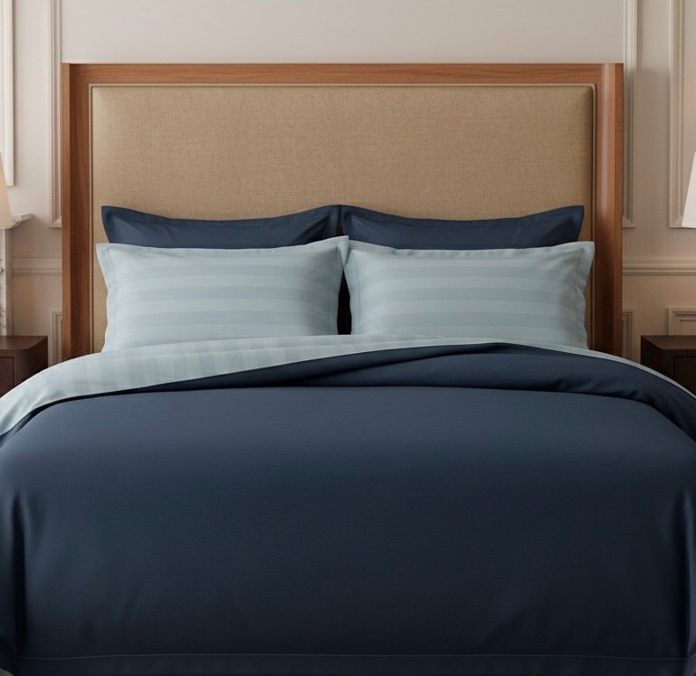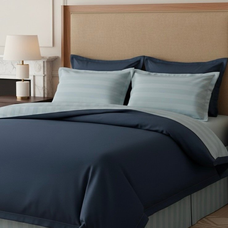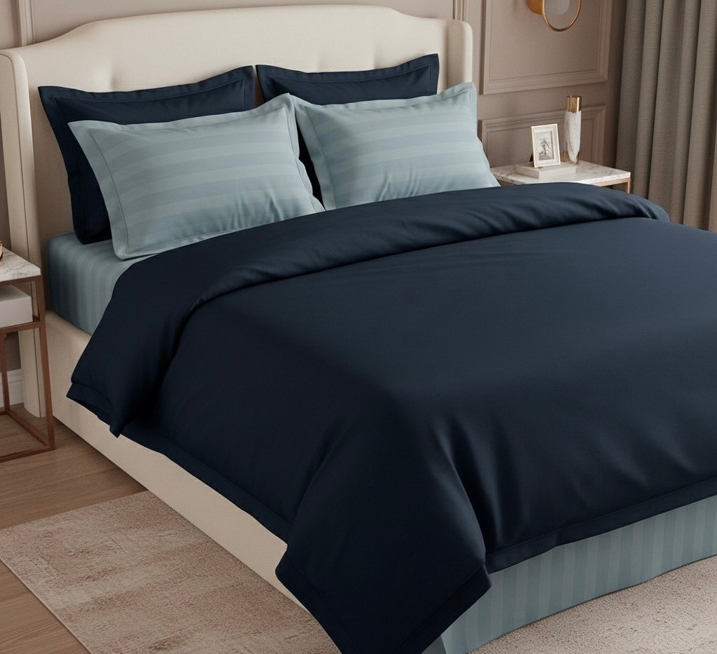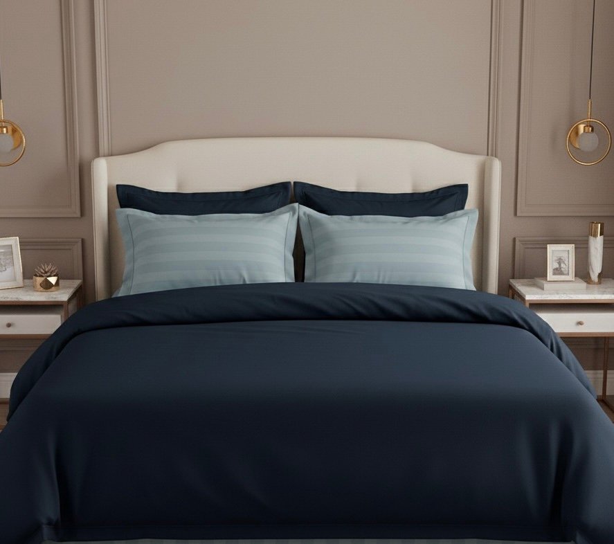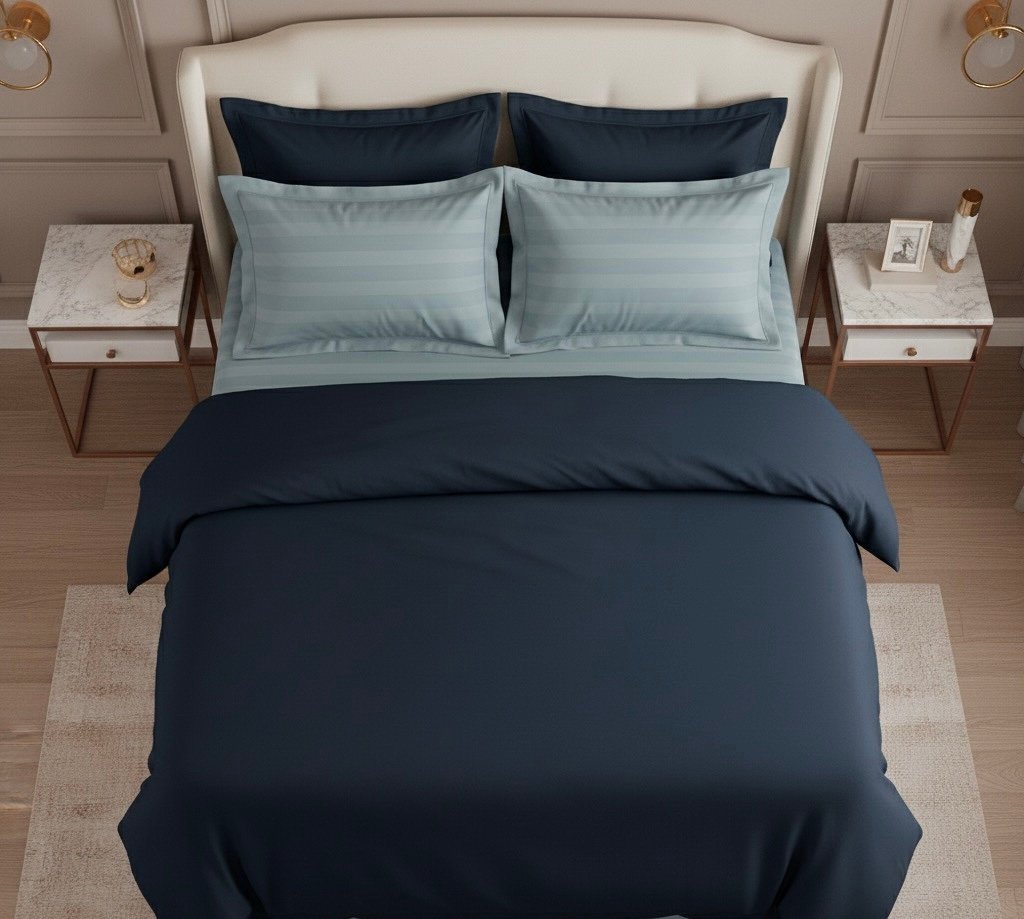 Premium Cotton Bedding Set – Blue Striped & Charcoal Blue (King Size)