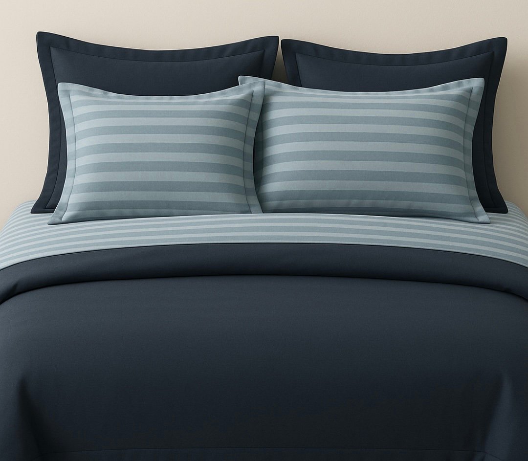 Coordinated with the bedsheet in the same 600 TC blue self-striped cotton, designed with clean edges and a refined aesthetic.