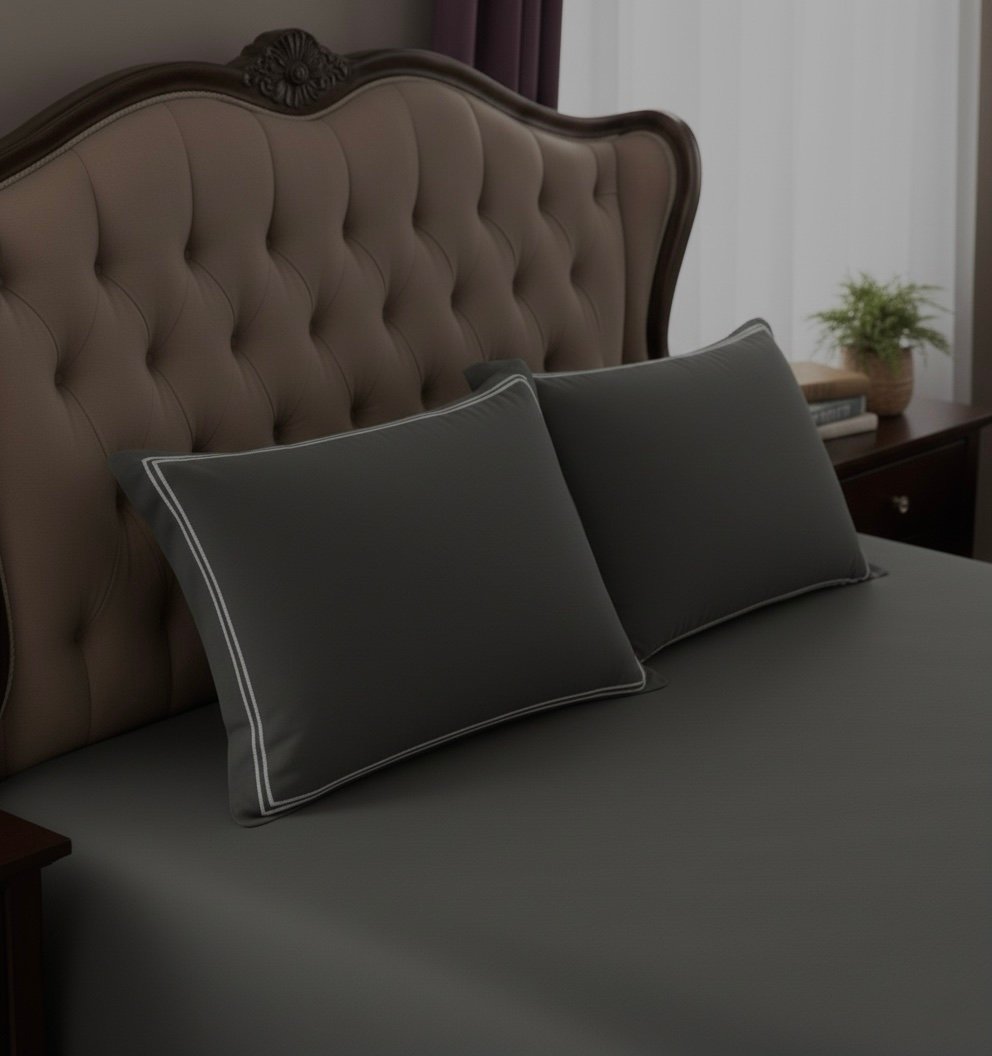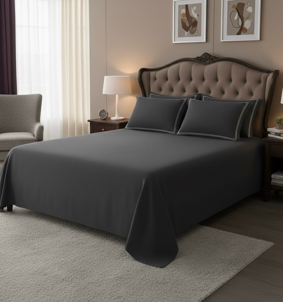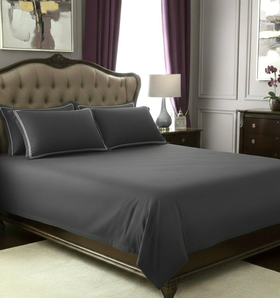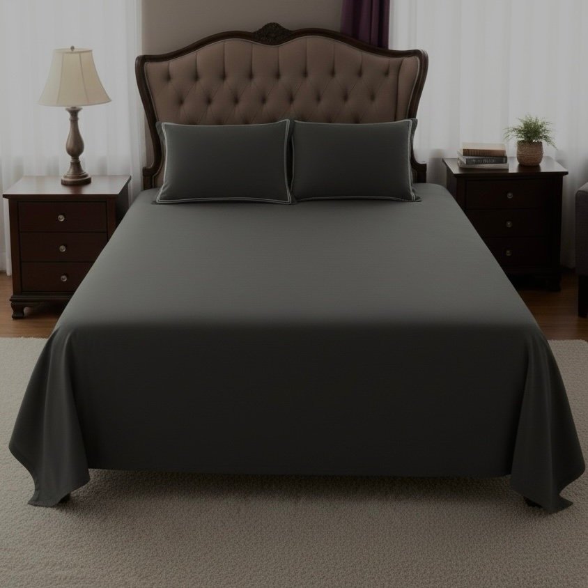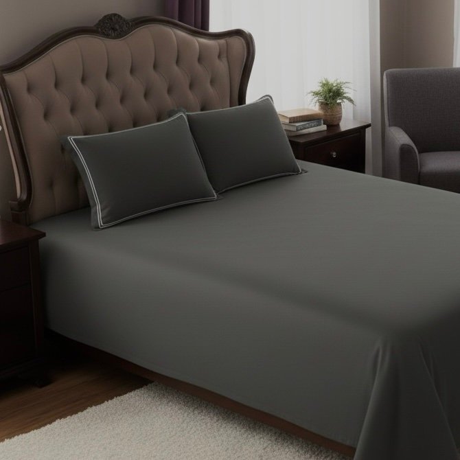 Premium Grey 400 TC bed sheet set with soft 100% cotton fabric and elegant double-merrow pillow covers. Smooth finish, long-lasting quality, perfect for modern bedrooms.