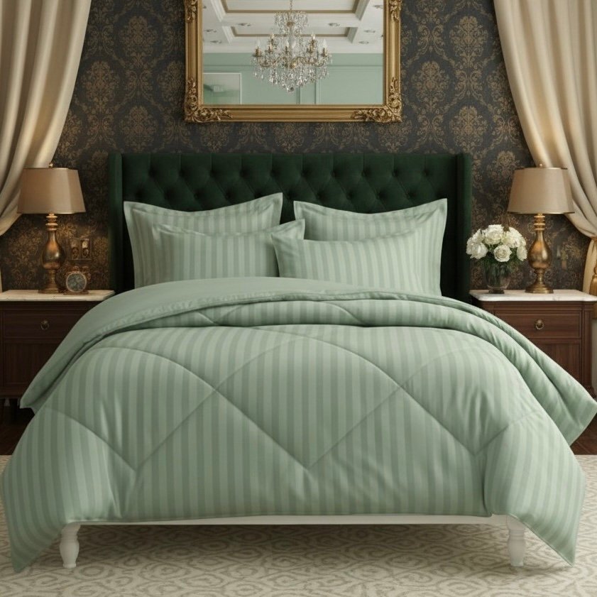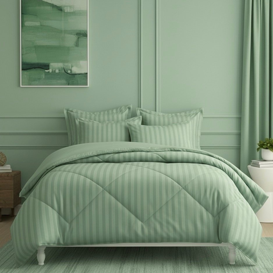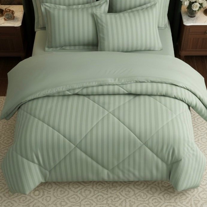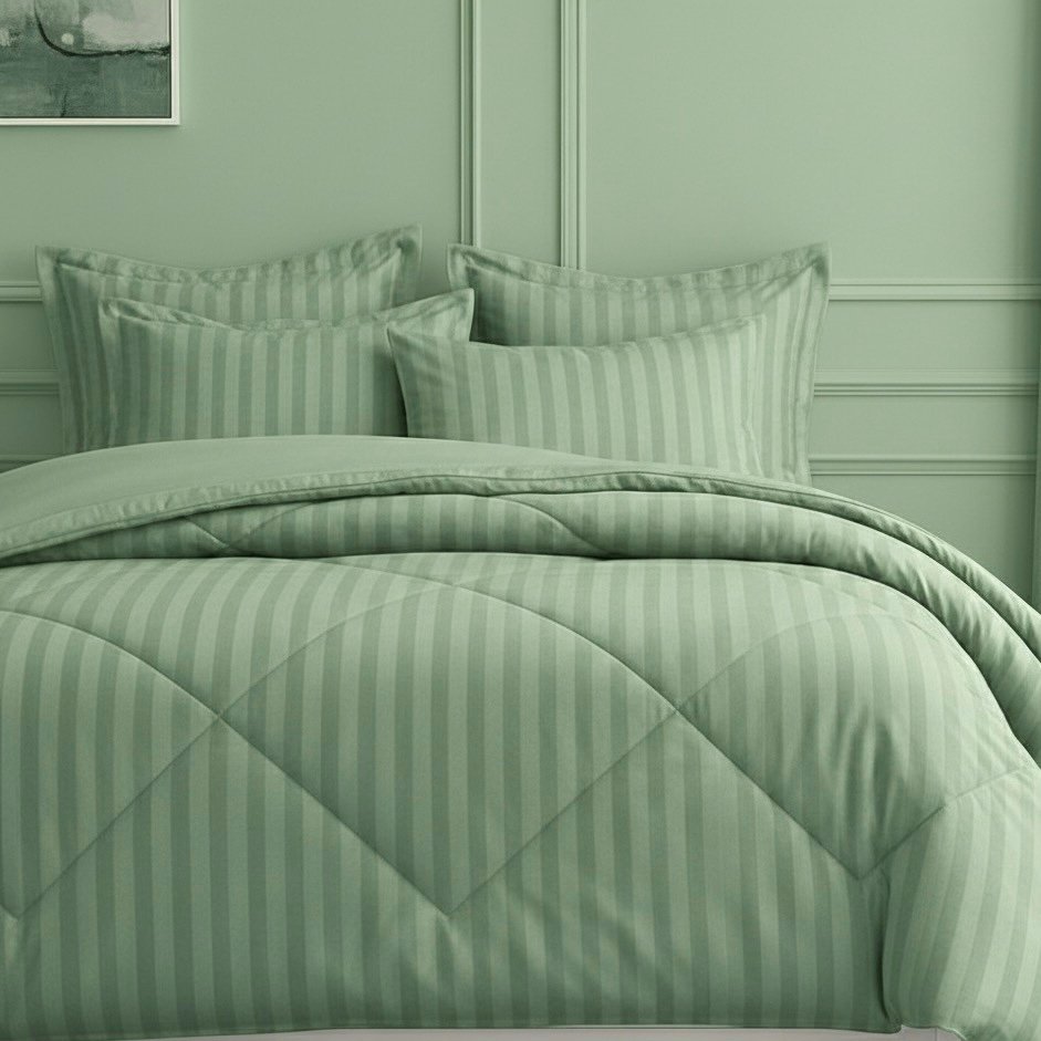 Made from 100% cotton with a 400 thread count sateen weave, this mint green comforter features a criss-cross stitch pattern for even fill and a smooth, breathable feel. Luxurious, lightweight, and perfect for year-round comfort.