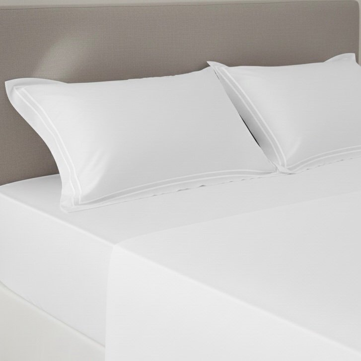 Note: The Merrow white embroidery line is stitched exclusively on the pillow covers and is not present on the flat bedsheet.