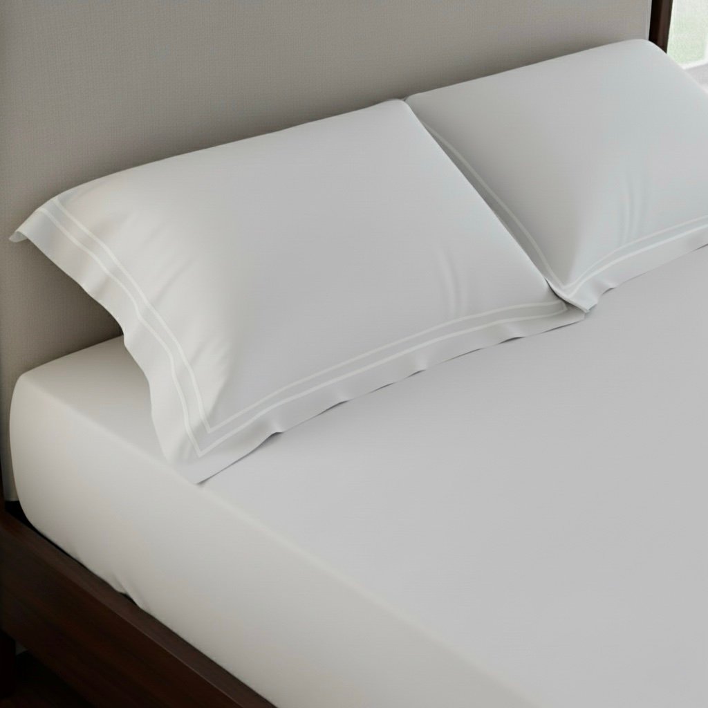 Premium white 400 TC bed sheet set with soft 100% cotton fabric and elegant double-merrow pillow covers. Smooth finish, long-lasting quality, perfect for modern bedrooms. Pillow covers feature clean white stitched lines, while the bed sheet remains plain for a minimal, elegant look.